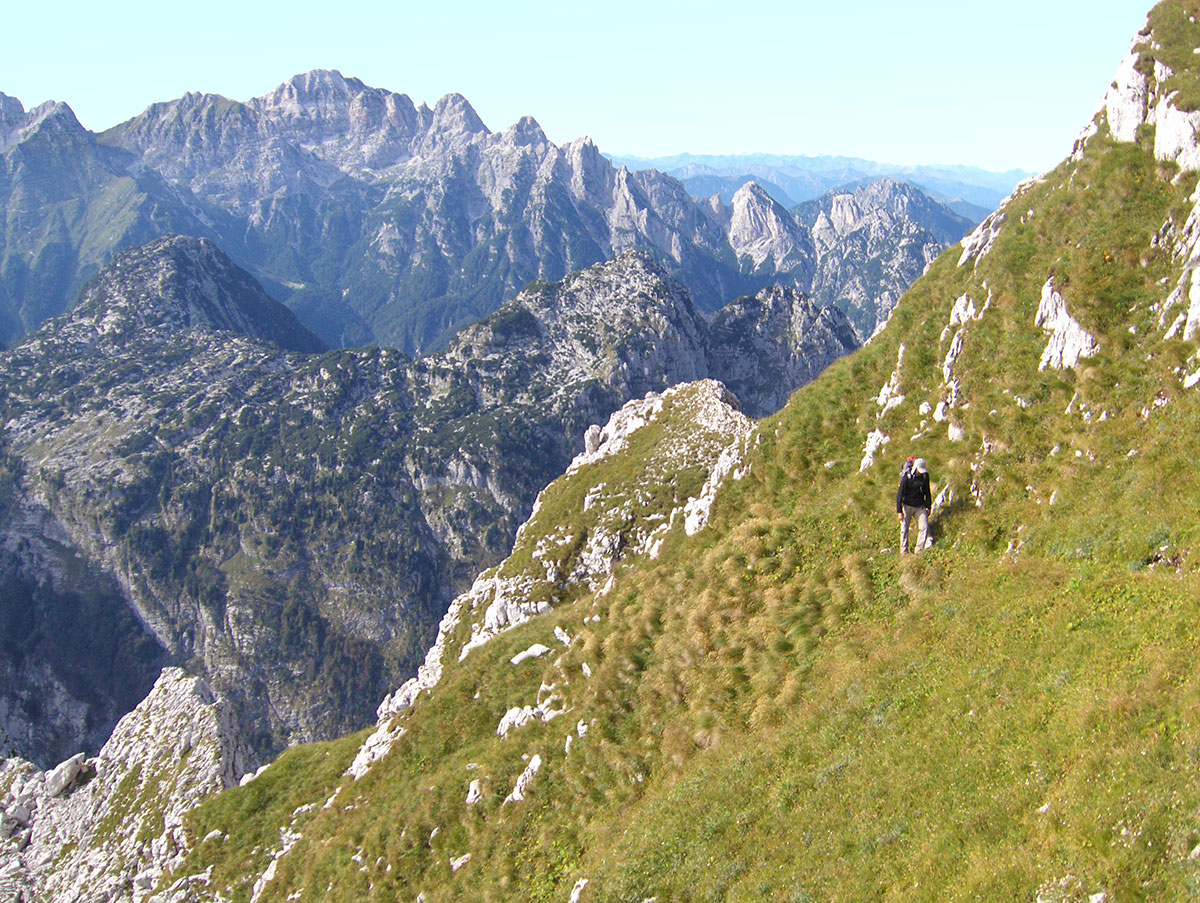 Od raskrižja na sedlu Sella Prevala dalje prema Rombonu nigdje nikog na vidiku samo smo nas dvojica. Priječimo južne padine pod vrhom Lopa / Monte Leupa (2403 m). Niže staze s desne strane u lijepoj dolini na Krnici stiže stado ovaca na ispašu. Tom dolinom prolazi planinarska markirana staza koja iz Bovca vodi na sedlo Sella Prevala.