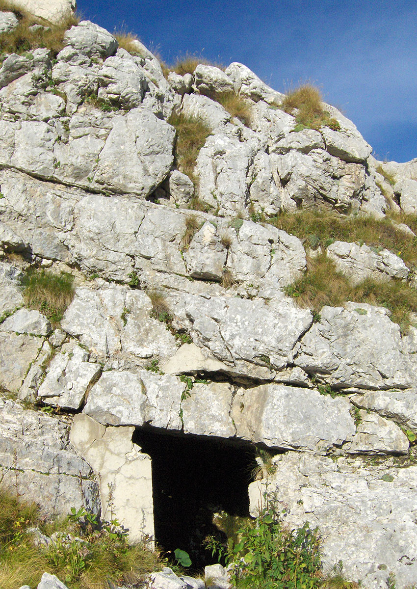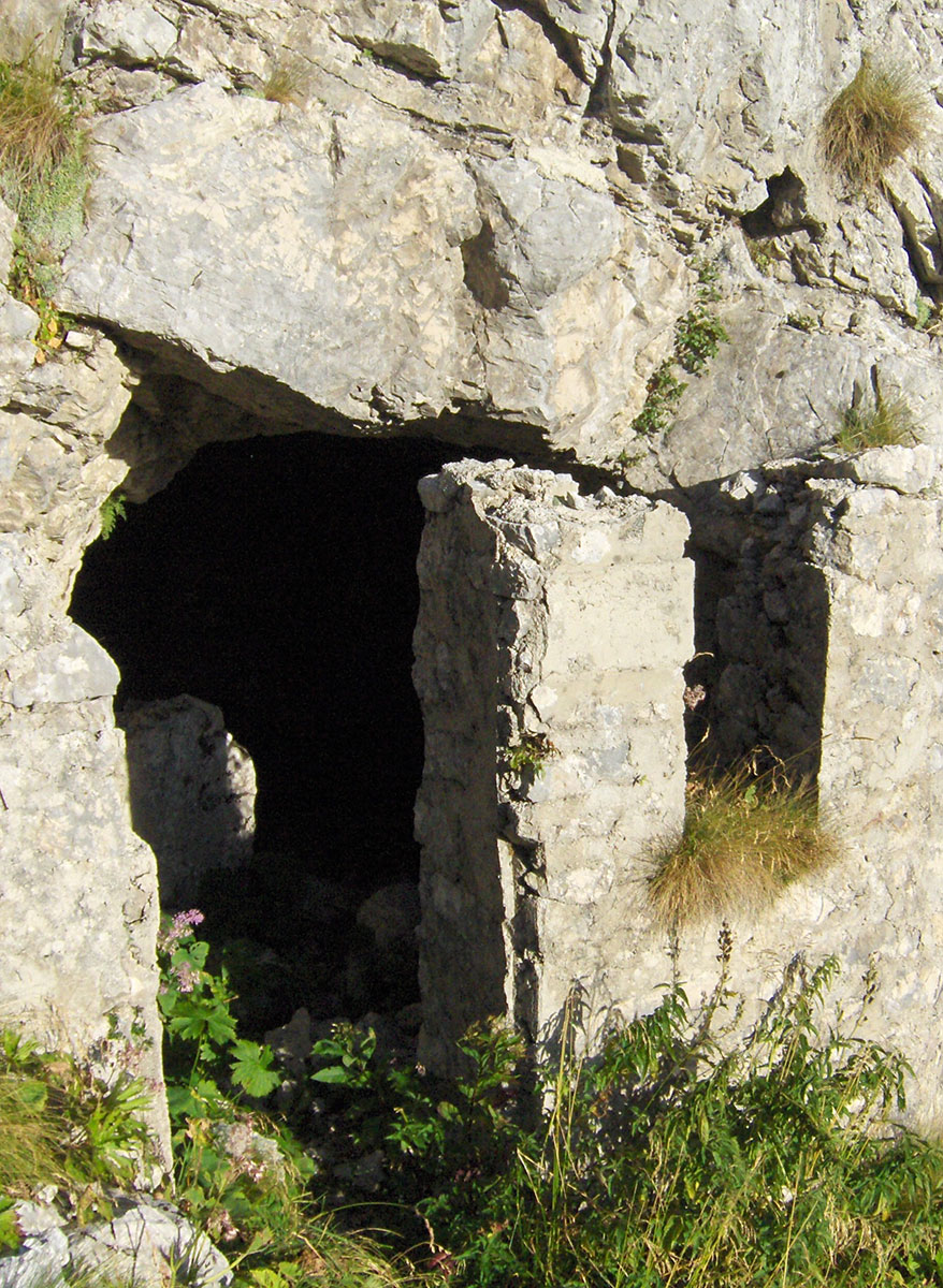 Vrijeme brzo prolazi i dan je već na izmaku a mi smo tek na Čukli, gladni, žedni i umorni od dugog hodanja po velikoj vrućini. Računamo, ako ovdje kod spomenika napravimo pauzu onda će nas mrak dočekati u šumi. Tješimo se da imamo čeone baterijske svjetiljke koje nam mogu pomoći pod uvjetom da je i dalje dobro markirana staza. Rizikujemo i ovdje provodimo oko 30 minuta pauze za odmor i jelo. Vrućina je u međuvremenu znatno popustila i osvježeni spuštamo se ubrzano serpentinama mulatjere. Prolazimo pored mnogobrojnih kaverni i ruševnih vojnih objekata. U jednoj stijeni dužine oko 50 m isklesane su mnoge puškarnice i vjerojatno su povezane hodnikom. Nemamo vremena da istražujemo, ubrzo stižemo na raskrižje sa kojeg se desno odvaja planinarska markirana staza koja preko Rupa i sedla Sella Prevalu vodi do stanice “D“. Nastavljamo stazom ravno prema Bovcu i nakon svega 10 minuta hoda stižemo na manji travnati plato na kojem je smještena lovačka koliba Goričica (1336 m/nv).