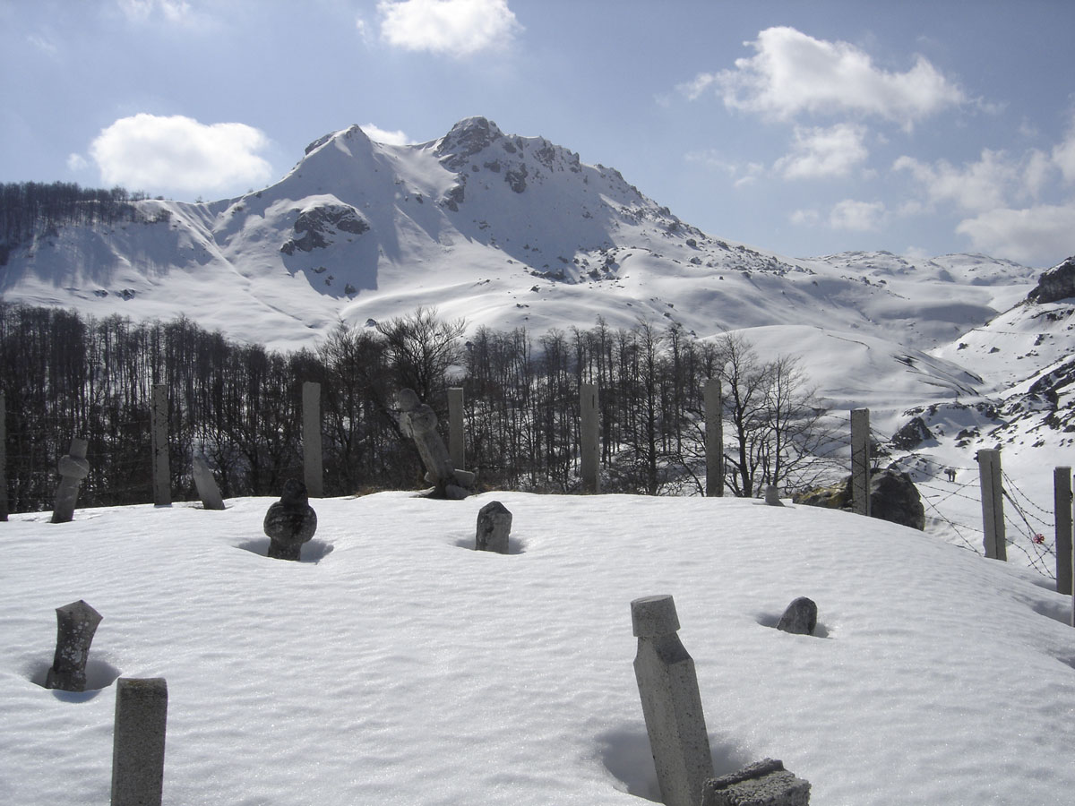 Naslovna slika: Bjelašnica, stećci u selu Gornji Lukomir (1460 m/nv), na slici u pozadini planina Visočica (1967 m/nv)